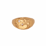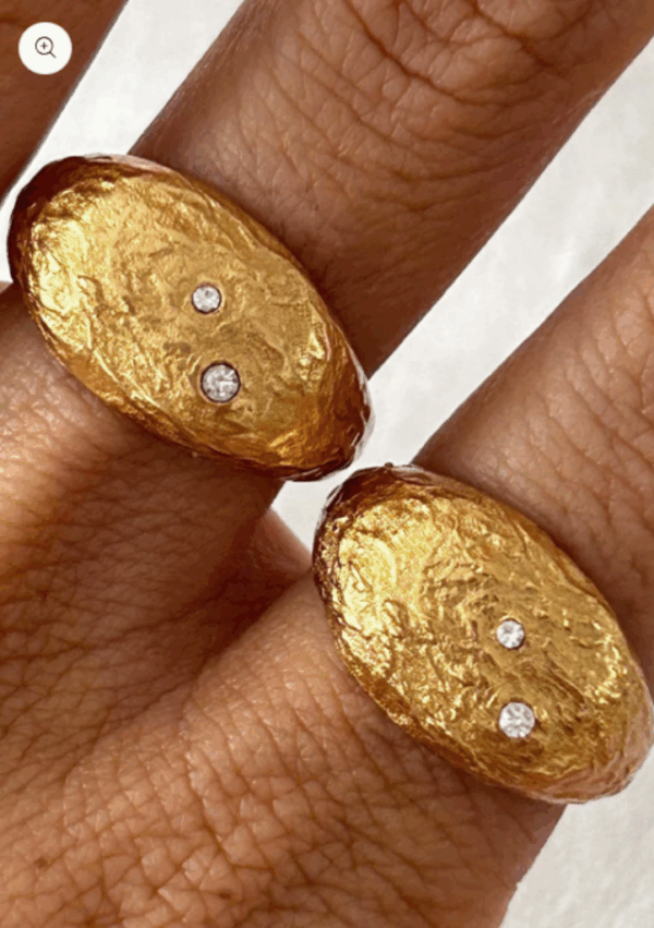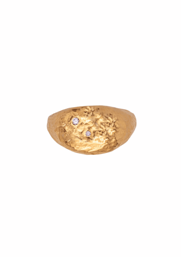 Deux zircons taillés sur le dessus de la bague apportent une touche de lumière à ce bijou au caractère brut et hypnotique.