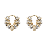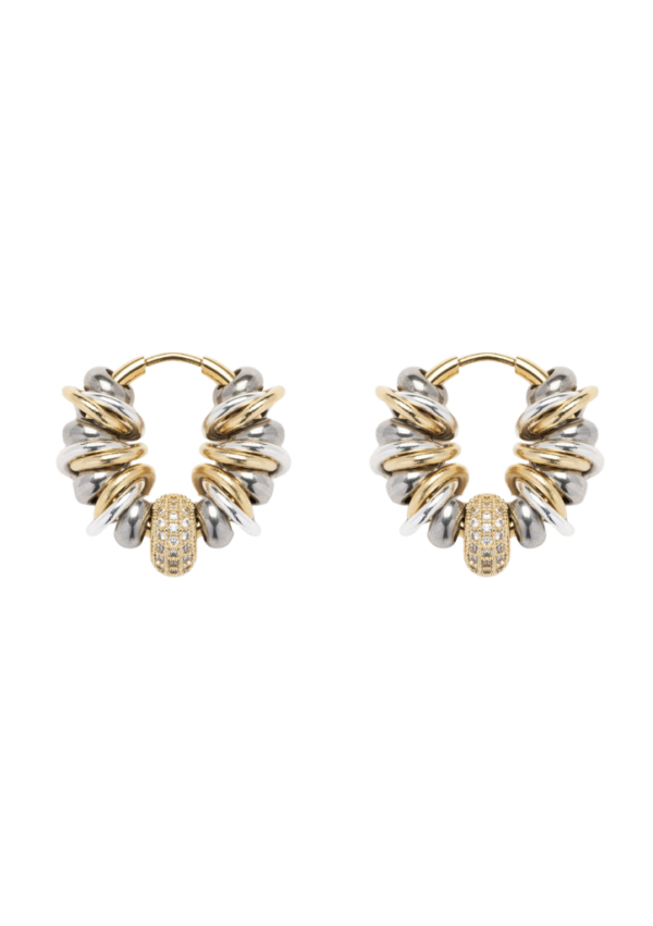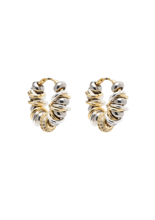 Ces créoles bicolores sont rythmées par un enchaînement d’anneaux dorés et argentés, ponctuées de perles argentées métalliques et sublimées par une perle centrale en oxydes de zirconium.