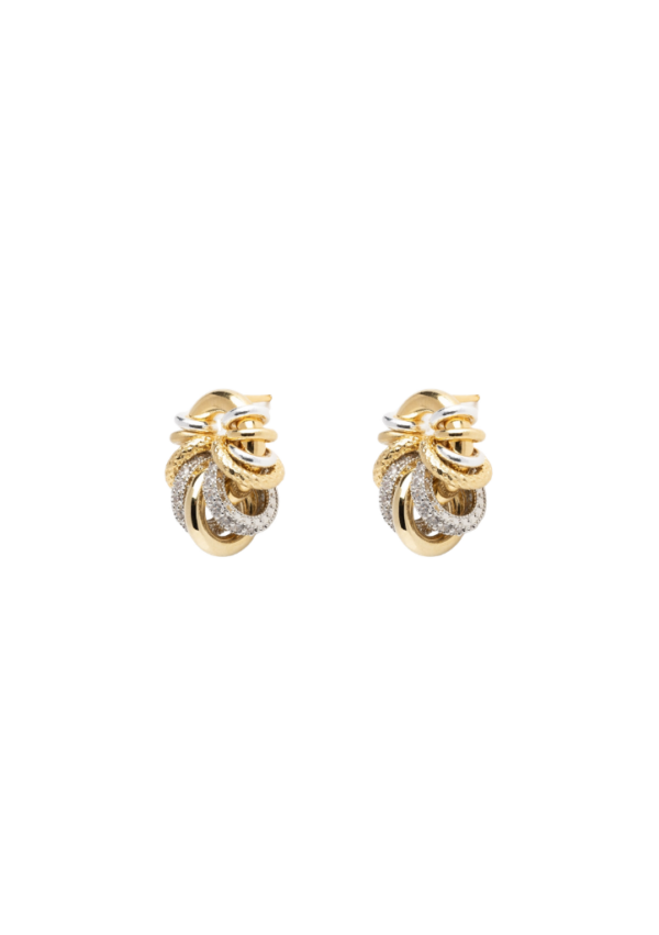 Graphiques et lumineuses, nous aimons ces boucles d’oreilles pour leur jeu de volumes, de textures et de couleur: une composition d’anneaux bicolores, s’entrelace avec des détails en oxydes de zirconium pour créer un bijou moderne et raffiné.