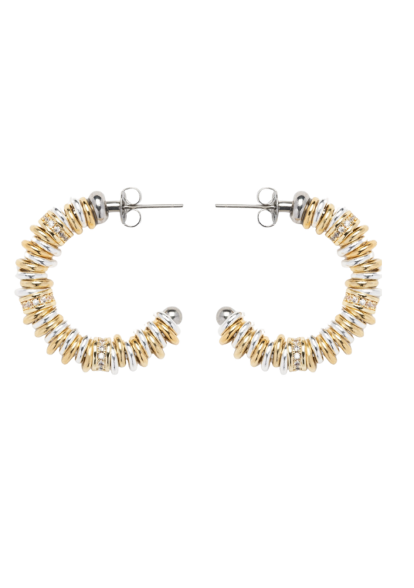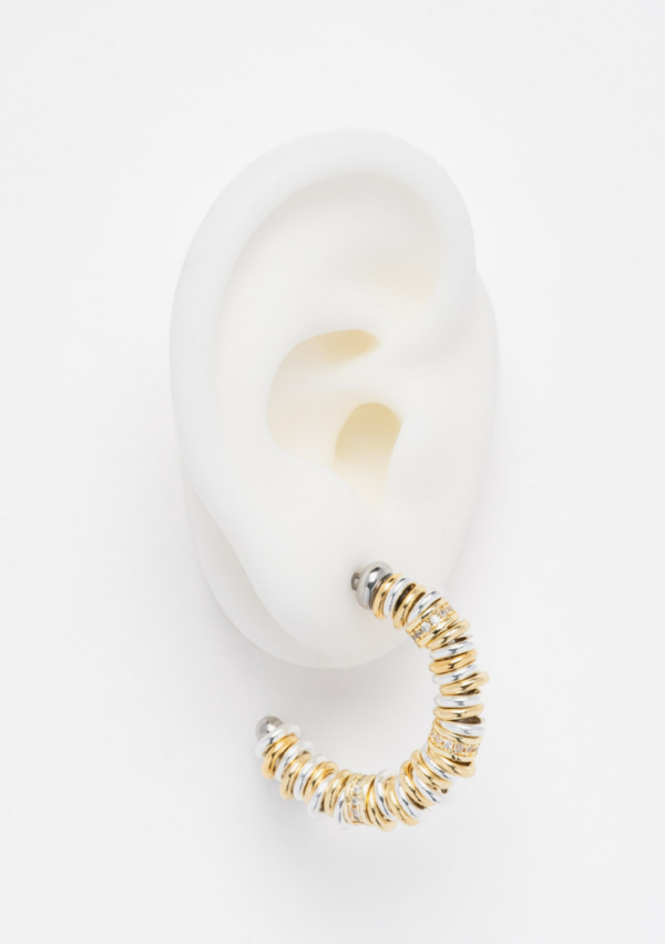 Ces créoles SIGAL jouent sur un volume plus affirmé que la version baby, avec leurs anneaux de différentes tailles entremêlés or et argent. Les détails en oxydes de zirconium apportent de l’éclat et soulignent le design graphique de la pièce.