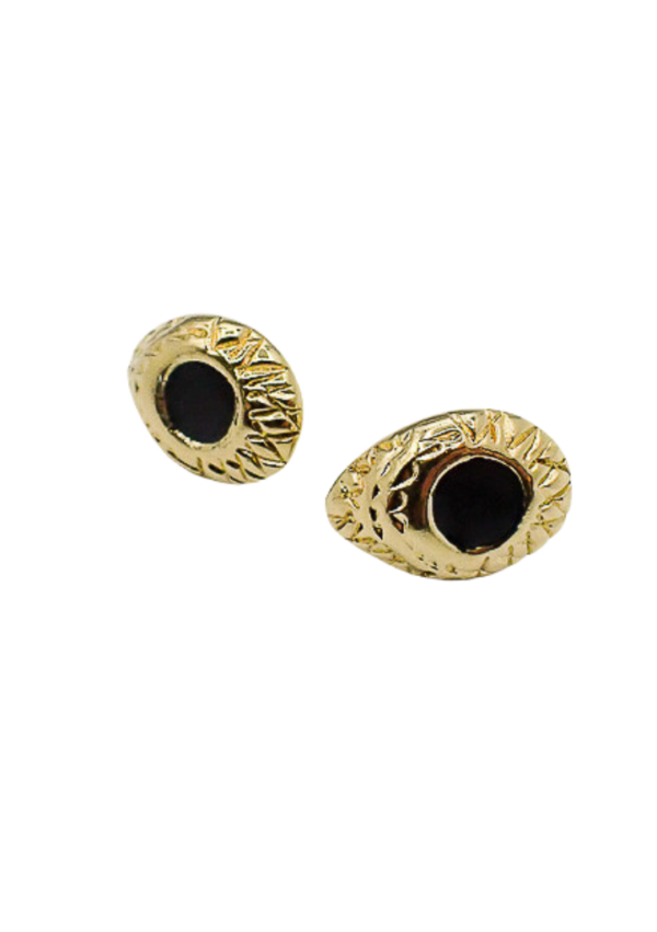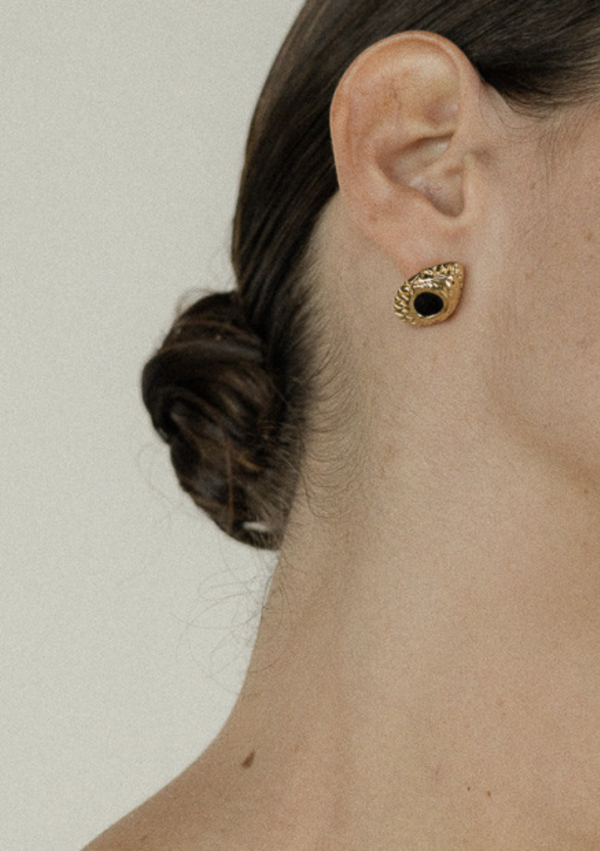 Les boucles d’oreilles Drago sont inspirées d’une petite amulette sculptée, comme un objet protecteur que l’on porterait près de soi. Leur forme est volontairement irrégulière, semblable à un galet façonné par le temps. Au centre, un point de laque noire attire le regard.