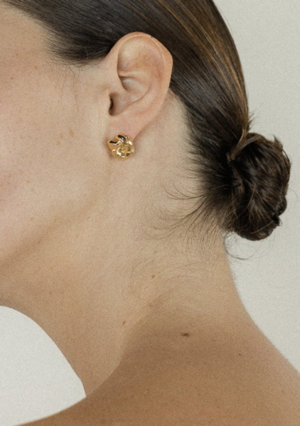 Les boucles d’oreilles Lou revisitent la puce dorée dans un esprit couture élégant.