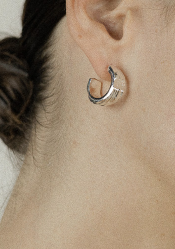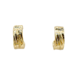 Ces petites créoles dorées au format court et au volume légèrement épais sont sculptées dans un métal texturé aux reliefs irréguliers. Leur surface travaillée capte la lumière et révèle un jeu de creux et de matières.