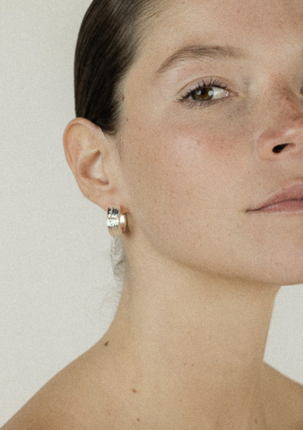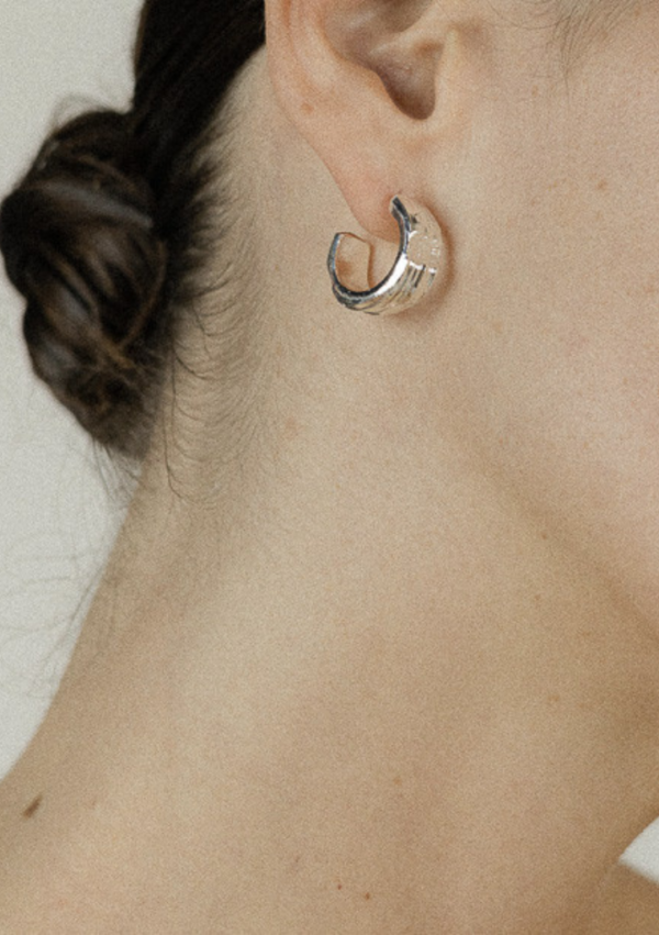 Petites créoles au format court et épais, façonnées dans un métal aux reliefs irréguliers. Leur texture creusée joue avec la lumière et évoque une matière brute, presque minérale, entre roche polie et écorce sculptée. Malgré leur présence, leur format compact conserve une vraie finesse.