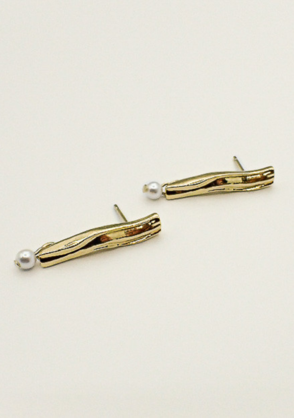 Petites boucles d’oreilles en forme de bâton dorées, au design fin et vertical sous lesquelles on retrouve une petite perle en verre blanche suspendue. Elle capte la lumière et apporte une touche douce et lumineuse, créant un joli contraste avec le métal texturé.
