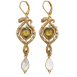 Ces boucles d’oreilles délicates mettent en scène un serpent finement sculpté enlacé autour d’un cœur semi-précieux facetté, entouré de petites fleurs émaillées et prolongé par une goutte de nacre lumineuse. Inspirées des ex-voto et des symboles protecteurs, elles apportent une touche précieuse et poétique à la silhouette.