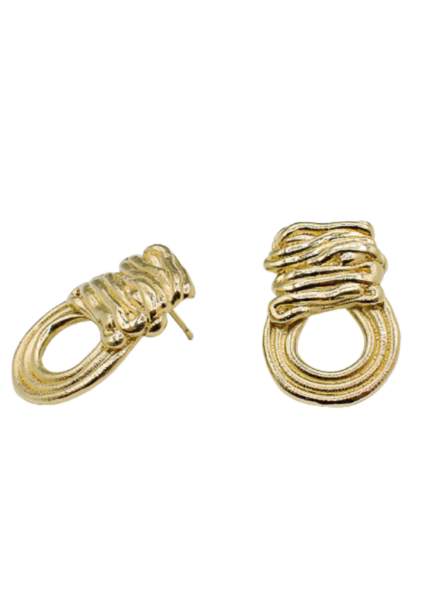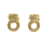 Ces boucles d’oreilles dorées au design organique, sont composées de deux éléments complémentaires : une partie supérieure sculptée, semblable à un ruban de métal délicatement ondulé, et un anneau circulaire lisse qui vient équilibrer l’ensemble.