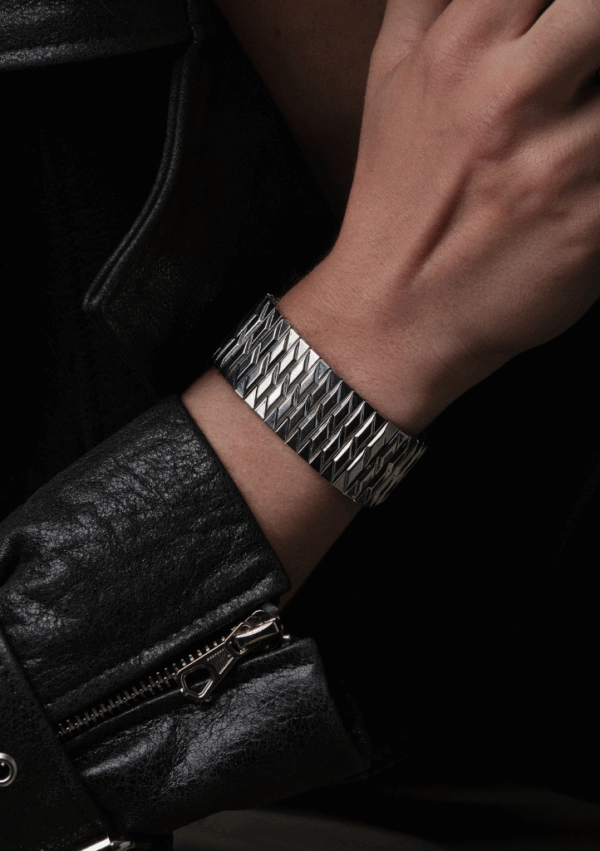 Son rendu visuel est à la fois brut et raffiné, avec un jeu de lumière saisissant grâce aux facettes angulaires de chaque élément. Grâce à son bracelet extensible , il épouse le poignet avec élégance et caractère. Un pièce forte pour celles et ceux qui aiment les bijoux au design puissant et contemporain.