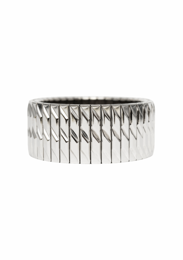 Cette version nous séduit par sa structure géométrique répétitive : une série de maillons en forme de chevrons créant un motif dynamique.