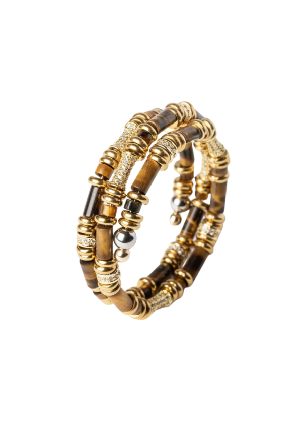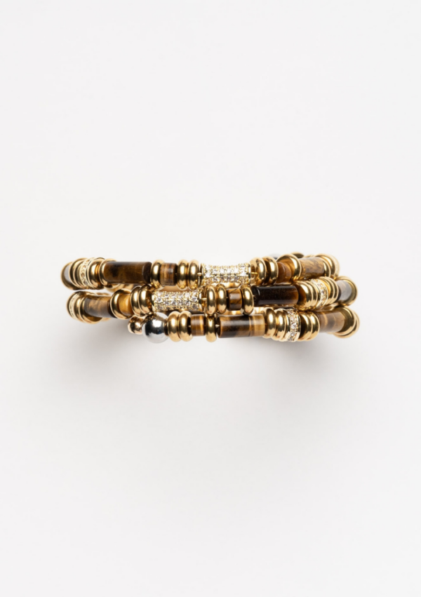 • Laiton, perles de turquoise africaine ou œil de tigre, oxydes de zirconium