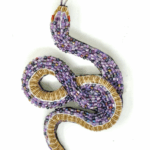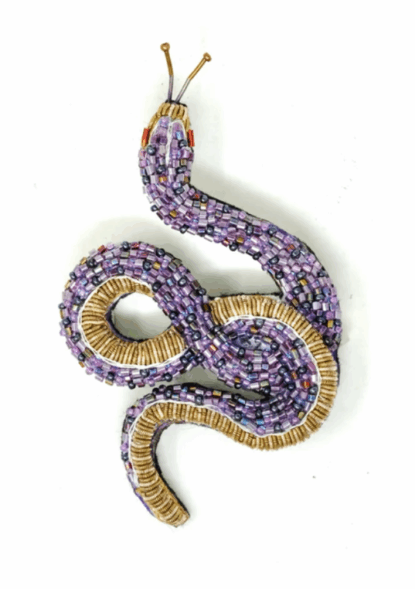 Broche brodée de perles et de sequins, représentant un serpent de couleur violette.