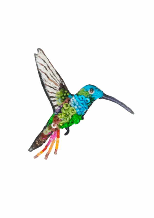 Broche brodée de perles et de sequins, représentant un colibri a gorge émeraude : petit colibri au plumage vert scintillant, souvent présent dans les régions tropicales.
