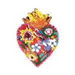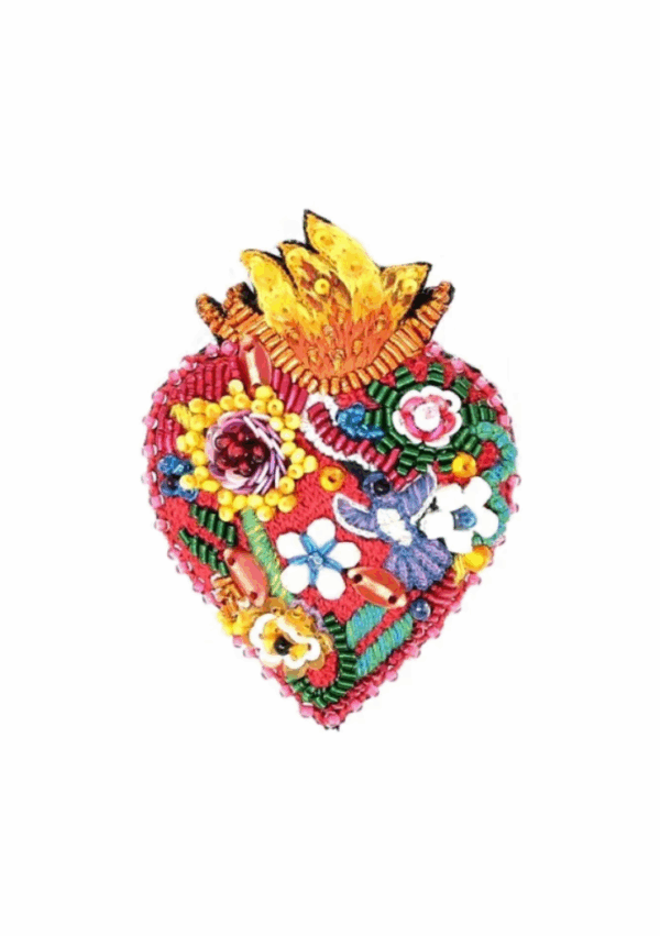 Broche brodée de perles et de sequins, représentant un cœur ardent.