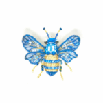 Broche brodée de perles et de sequins, représentant une « Abeille maçonne ». C’est une petite abeille solitaire connue pour construire ses nids dans des cavités à l’aide de boue (d’où son nom). Elle est très utile à la pollinisation.
