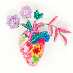 Broche brodée de perles et de sequins, représentant un coeur végétal.