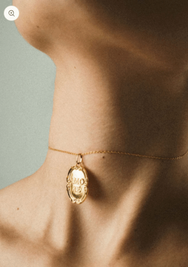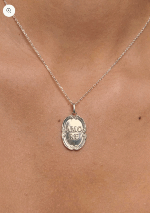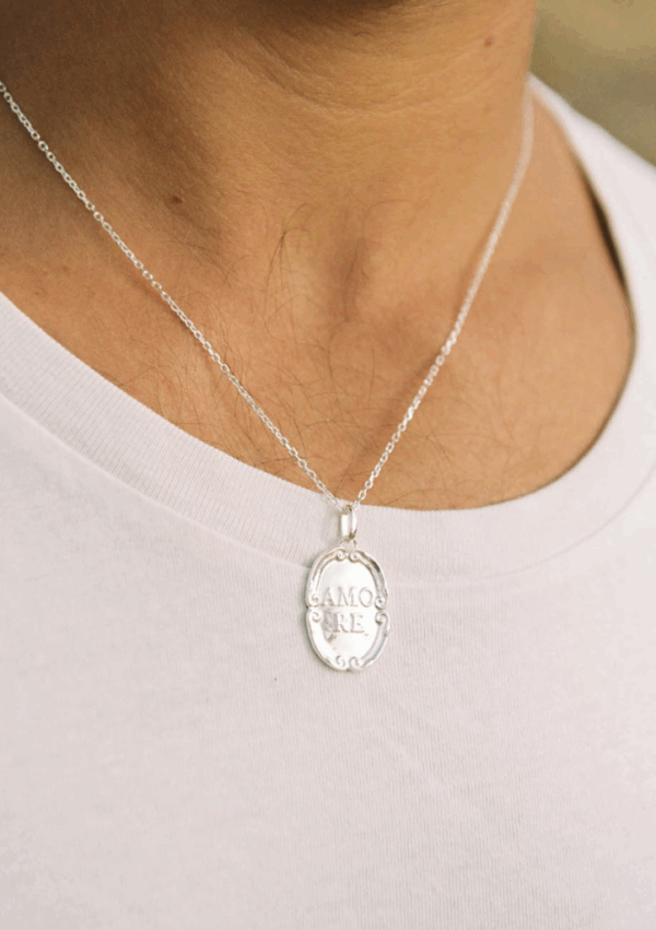 Inspiré de l’esthétique baroque, ce collier se distingue par sa médaille gravée du mot italien Amore, véritable ode à l’amour.