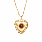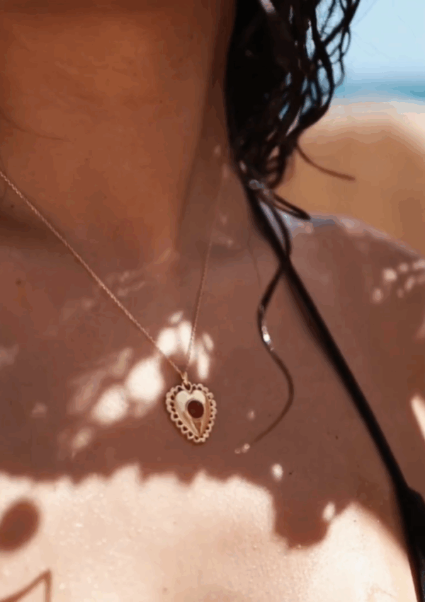 Le collier Coeur c’est une médaille dentelée en forme de cœur sertie d’une agate grenat, sur une chaine fine dorée. Inspiré des cultures méditerranéennes où amour rime avec intensité, ce bijou mêle élégance, romantisme et caractère.