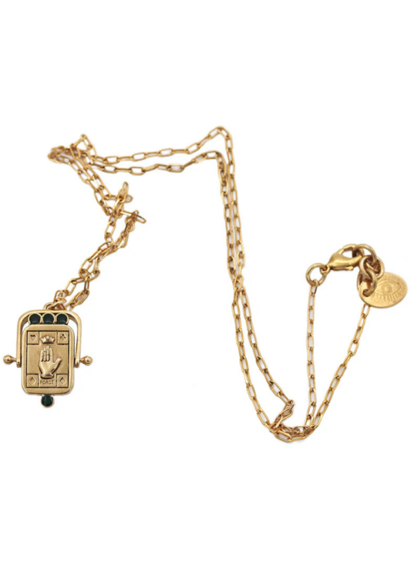 D’un côté, la carte « Force » finement gravée et soulignée de quatre points d’émail émeraude ; de l’autre, une pierre semi-précieuse facettée qui capte la lumière. Un bijou symbolique et singulier, pensé comme un talisman moderne à porter selon l’envie.