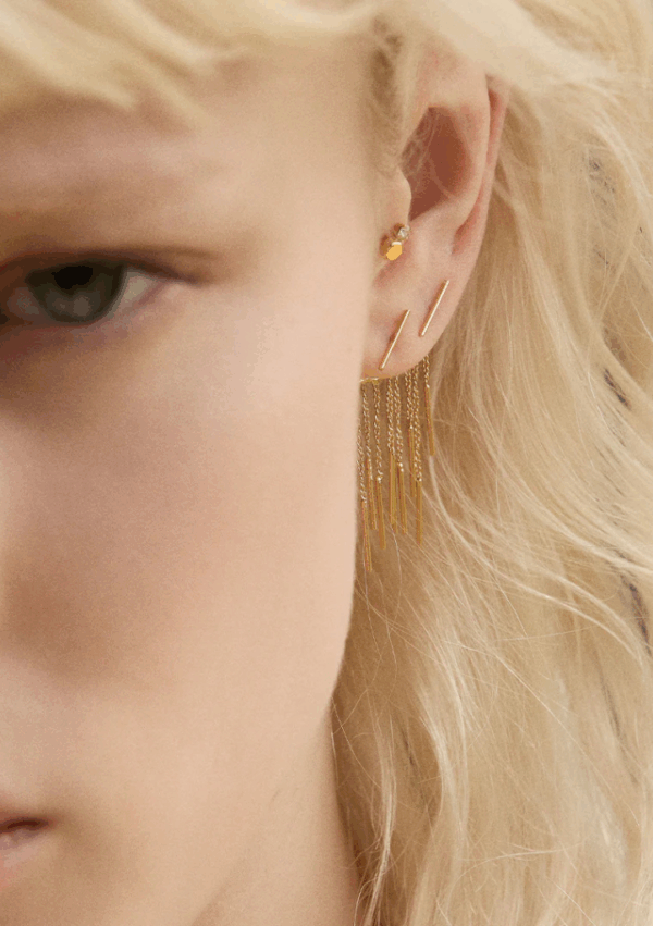 Un dessous d’oreille : une petite barre fine à l’avant et 4 chaines délicates à l’arrière, qui donnent à la boucle son mouvement et sa forme singulière.