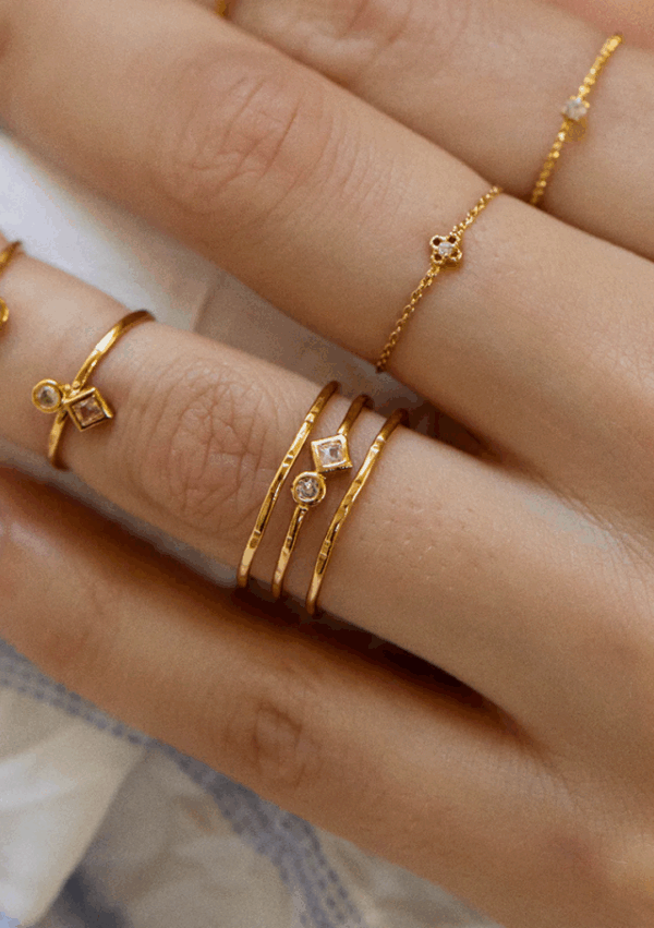 Dorés à l’or fin, ornés de strass ou de pierres semi-précieuses, les bijoux sont pensés pour être portés chaque jour, comme une seconde peau.