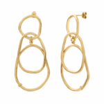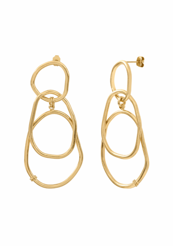 A la fois graphiques et organiques, ces boucles d’oreilles sont faites de trois anneaux irréguliers enchaînés pour former une silhouette légère et aérienne, qui accompagne chaque mouvement avec une élégance fluide.