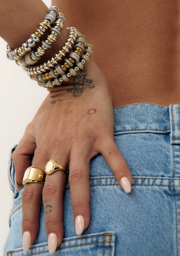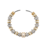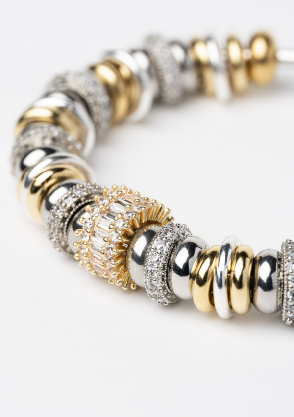 Bracelet jonc SIGAL composé d’une succession de perles et anneaux dorés et argentés rythmés par des détails en oxydes de zirconium. Ce jeu de volumes et de reflets crée un bijou lumineux et texturé, élégant.
