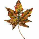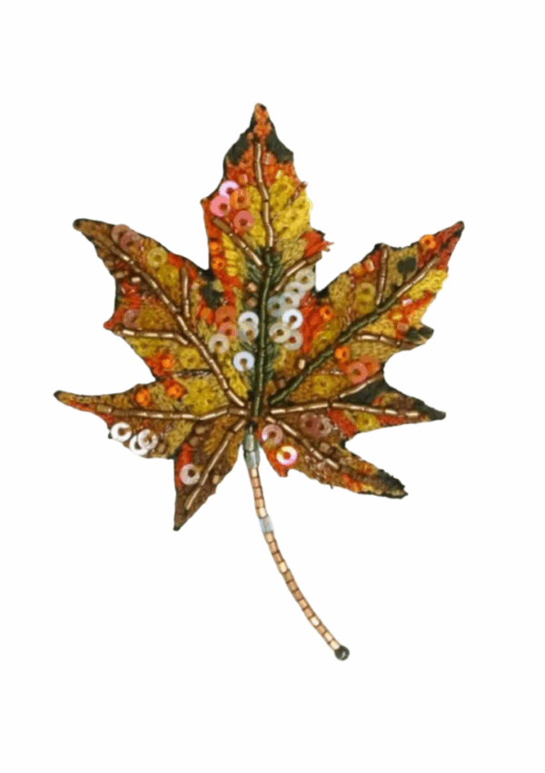 Broche brodée de perles et de sequins, représentant une « feuille d’érable du vent du Nord » aux couleurs de l’automne.