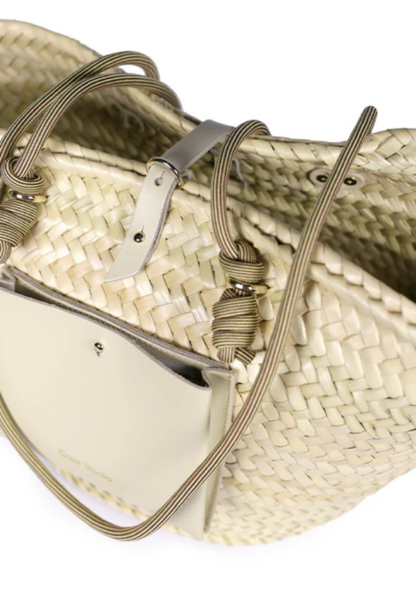 Il associe le doum naturel au cuir de vachette beige Crème, lumineux et élégant, pour une silhouette élégante et urbaine. Ses anses en corde d’escalade, mêlent nuances bordeaux et vanille et créent un contraste graphique et chaleureux.