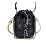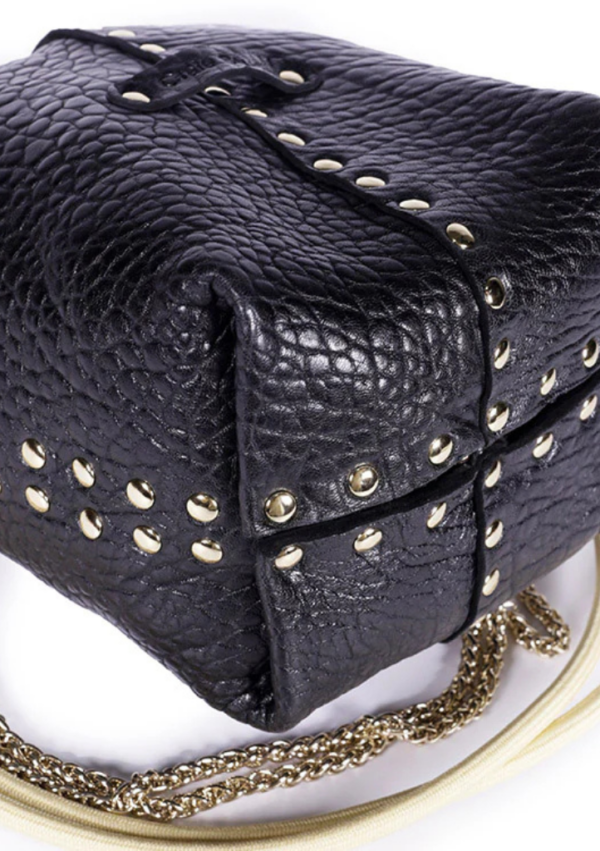 Sa structure unique, montée sans couture machine et entièrement façonnée par un jeu de rivets dorés, dessine un volume graphique à l’allure rock. Léger et compact, il accompagne le quotidien avec style et praticité.