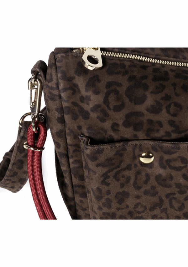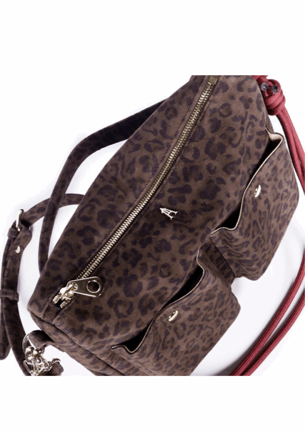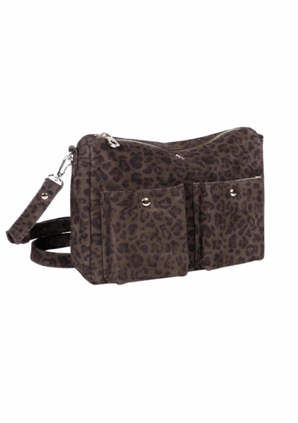 Fabriqué en cuir de chèvre velours brun imprimé d’un motif léopard subtil et protégé, le sac Système Léo Brun offre style et praticité au quotidien.
