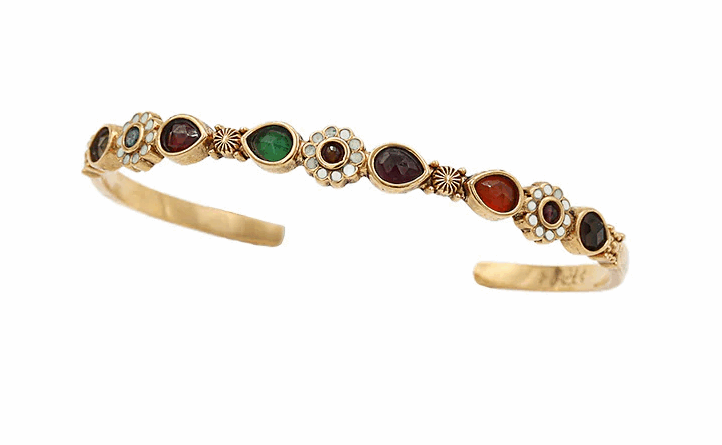 Jonc ajustable doré orné de pierres semi-précieuses et de fleurs émaillées.