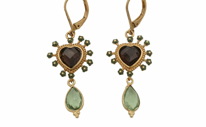 Boucles d'oreilles ex-voto dorées au cœur serti, émail coloré et pierre semi-précieuse suspendue.
