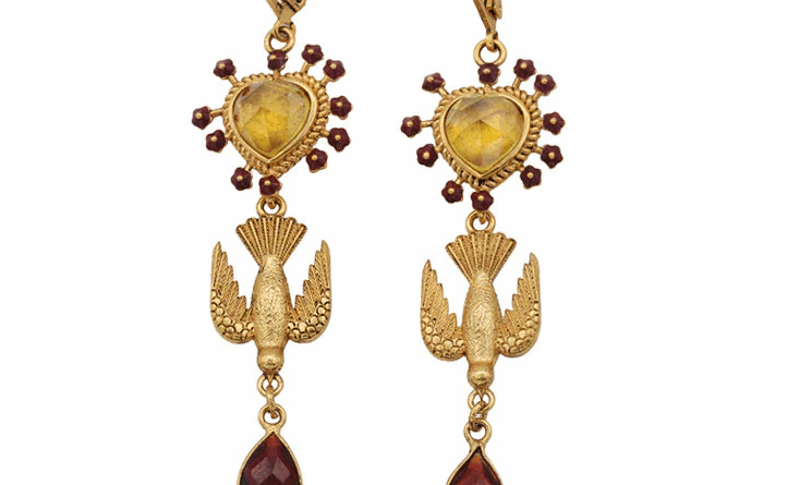 Boucles d’oreilles inspirées des ex-voto, dorées, ornées d’émail, de pierres semi-précieuses et d’un pendentif en forme d’oiseau.