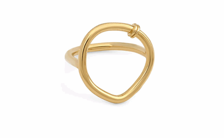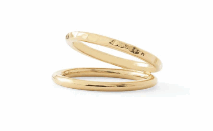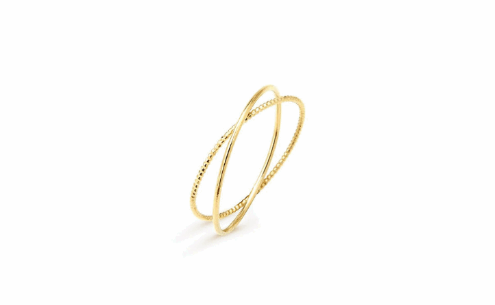 Deux anneaux dorés entrelacés, pour une bague sobre et élégante, inspirée de l’alliance.