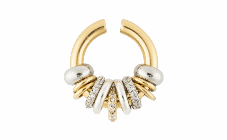 Earcuff sans piercing au design sophistiqué, mêlant anneaux dorés, argentés et pavés de strass zirconium.