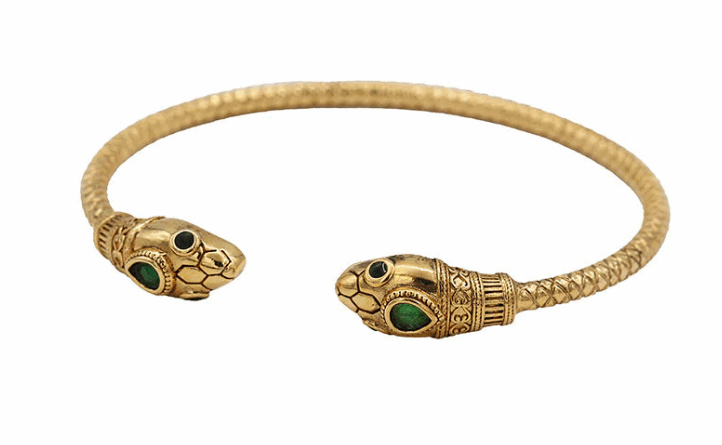 Bracelet jonc ouvert doré à l’or fin, orné de deux têtes de serpent serties de pierres semi-précieuses, symbole de force et d’éternité, modèle ajustable.