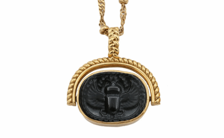 Sautoir talisman au médaillon pivotant, orné d’un scarabée protecteur inspiré de l’Égypte antique.