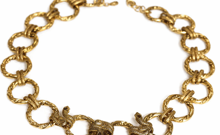 Collier doré à l’or fin orné de serpents entrelacés et de pierres semi-précieuses multicolores.