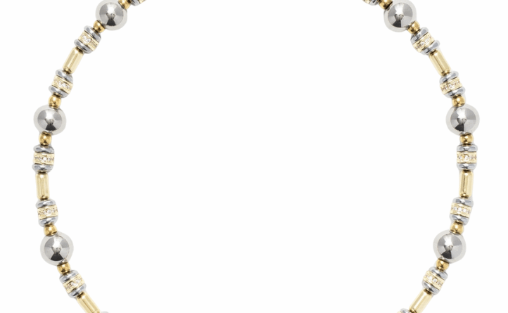 Collier court, lumineux et mêlant argent, or et pierres claires dans un jeu de textures et de reflets.